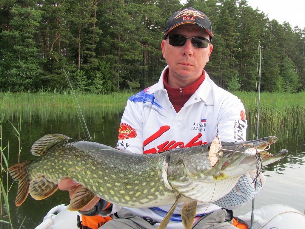 условиях. Приманка отправлялась в самую гущу травы и заросли камыша. Выдирал спиннер без церемоний мощным комплектом. Частенько всаживал его в жёсткие стебли камыша и приходилось на шнуре подтягиваться к зацепу, естественно на приманку была приличная нагрузка при этом. Количество поклёвок зашкаливало. Щучка в основном докилошная, но её много. Краска на сердечнике облезла, от силиконовой юбки осталось три волосинки, каркас был изрядно погнут и даже лепестку досталось, немного погнулся после пары прямых попаданий в пеньки. В общем, и я, и рыба - изрядно "поиздевались" над приманкой. Но спиннер продолжал работать. И вот уже под конец третий рыбалки, случилась мощнейшая поклёвка. После подсечки слабина. Подумал срез, но нет, поводок на месте и скрутка целая. Видимо крупной щуке хватило сил добить приманку мощными челюстями. На мой взгляд, спиннер прошёл все испытания и достойно показал себя.